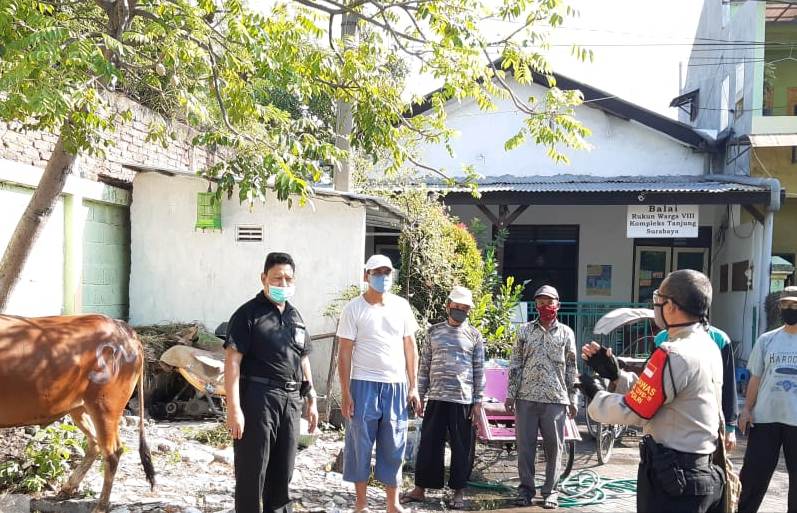 Seputarperak.com- Sosialisasi penerapan protokol kesehatan dalam pelaksanaan penyembelihan hewan kurban, disampaikan Aiptu Wiji Supriyadi, Babinkamtibmas Perak Barat, Polsek Krembangan, Polres Pelabuhan Tanjung Perak, kepada takmir dan jamaah Masjid Baitus Salam di RW 08.