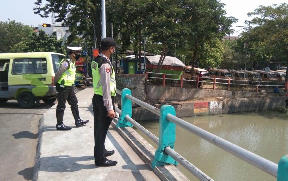 Seputarperak.com- Pemantauan debit air dilakukan personil Polsek Pabean Cantikan, Polres Pelabuhan Tanjung Perak di Sungai Kalimas, Kamis siang, 6 Agustus 2020.