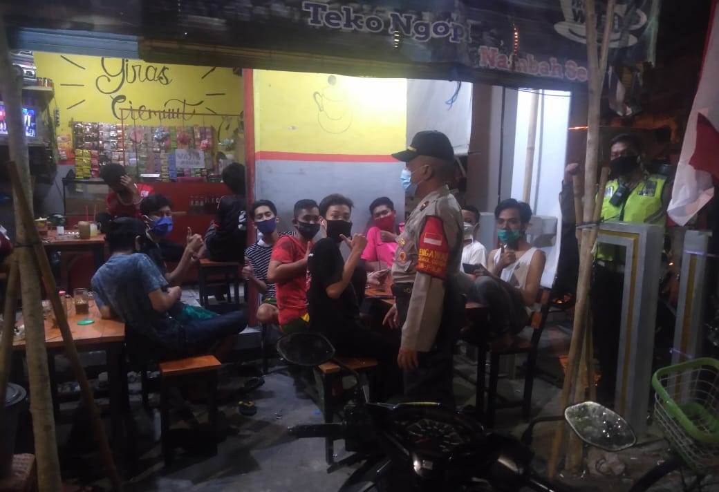 Seputarperak.com- Sosialisasi wajib masker disampaikan personil Polsek Semampir, Polres Pelabuhan Tanjung Perak di warung kopi (Warkop) Jalan Kunti, Jumat malam, 7 Agustus 2020.