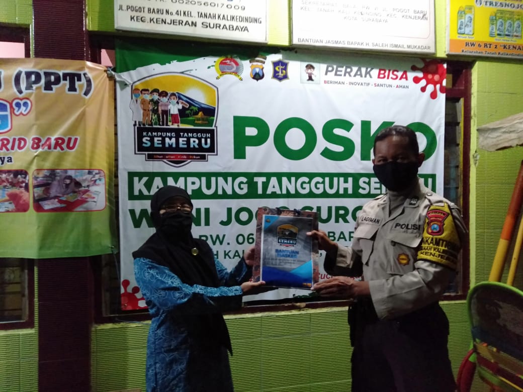 Seputarperak.com- Bantuan masker diberikan oleh Aiptu Lagiman, Babinkamtibmas Tanah Kali (Takal) Kedinding, Polsek Kenjeran, Polres Pelabuhan Tanjung Perak kepada Bapak Imam Sudjarwoto, ketua tim relawan Kampung Tangguh Semeru RW 01, Kelurahan Takal Kedinding.