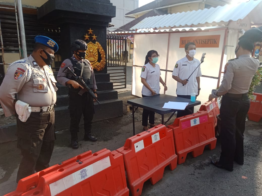 Seputarperak.com- Urkes Polres Pelabuhan Tanjung Perak melaksanakan pengecekan suhu badan di depan gerbang Mapolres, Sabtu pagi, 15 Agustus 2020.