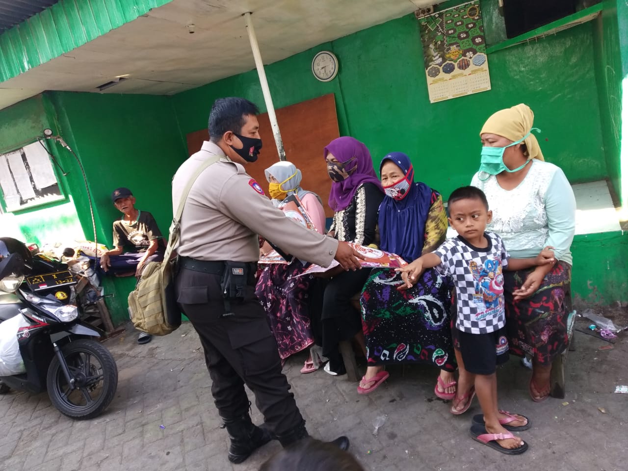 Seusai melakukan sosialisasi 3M, Bripka Victor memberikan sarana kontak berupa kerudung kepada masing-masing ibu-ibu yang ditemui.