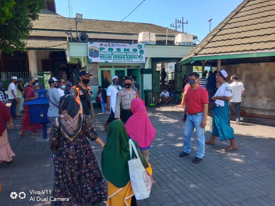 Seputarperak.com- Himbauan masker disampaikan personil Polsek Semampir, Polres Pelabuhan Tanjung Perak bersama Satpol PP kepada para pengunjung wisata religi Ampel, Sabtu pagi, 22 Agustus 2020.