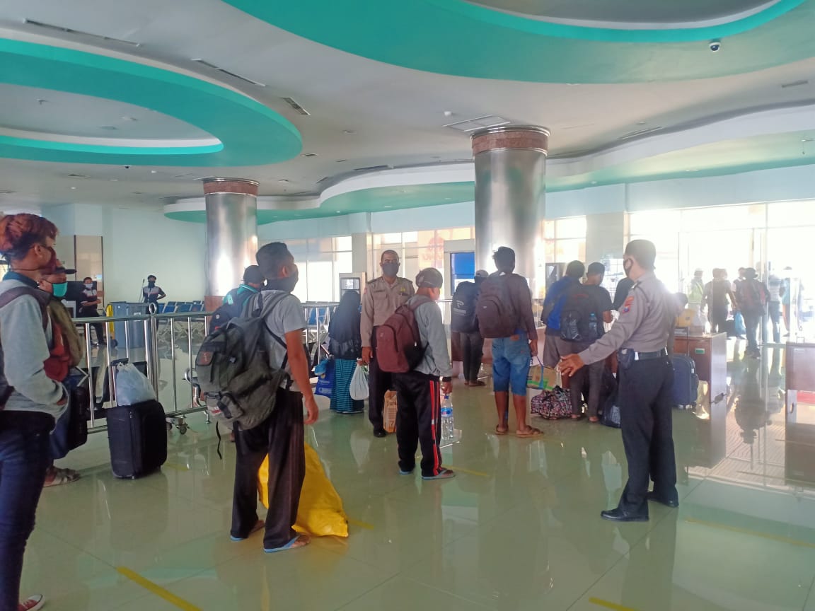 Seputarperak.com- Pengamanan pemeriksaan dokumen kesehatan penumpang kapal dilakukan personil Satsabhara Polres Pelabuhan Tanjung Perak di Pelabuhan Gapura Surya Nusantara (GSN), Kamis siang, 27 Agustus 2020.