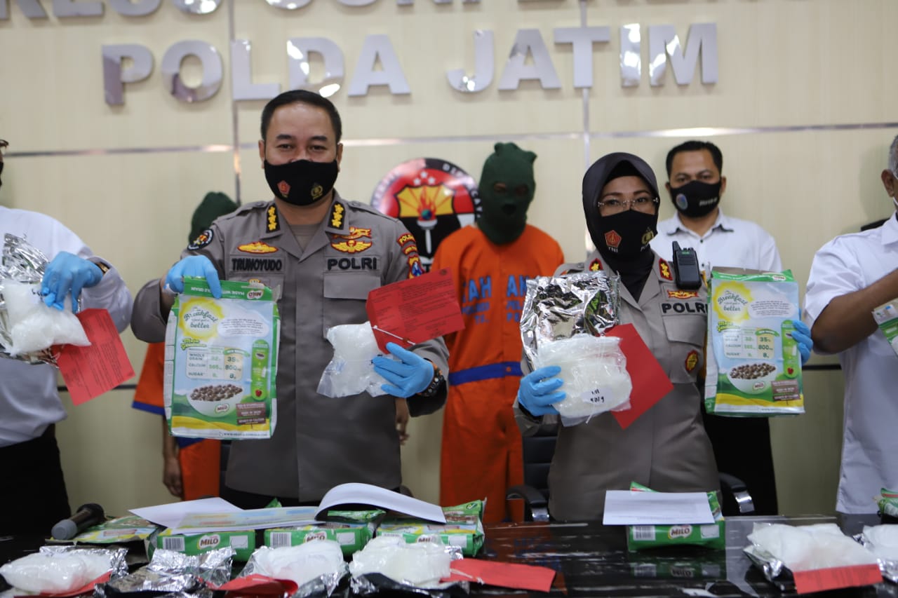 Konferensi pers yang dipimpin Kabid Humas Polda Jatim, Kombes Pol Trunoyudo Wisnu Andiko ini juga dihadiri Kapolres Pelabuhan Tanjung Perak, AKBP Ganis Setyaningrum, S.SI, MH dan Kasat Reskoba Polres Pelabuhan Tanjung Perak, AKP M Yasin.