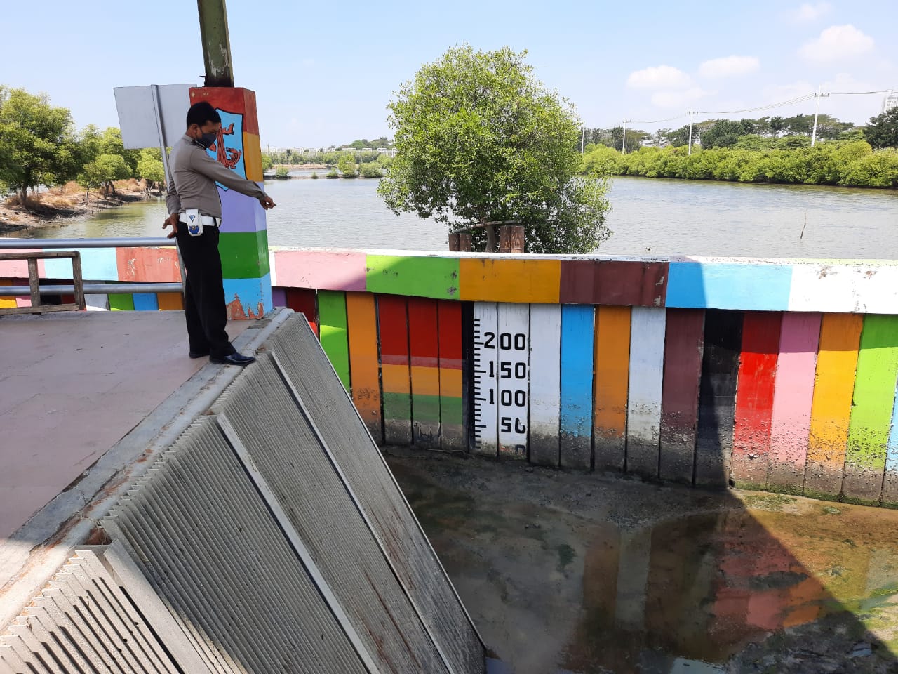 Seputarperak.com- Personil Polsek Kenjeran, Polres Pelabuhan Tanjung Perak memantau debit air di Pintu Air Kenpark, Kelurahan Bulak, Jumat siang, 4 September 2020.