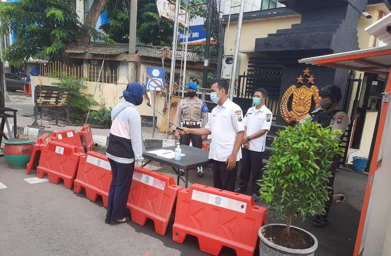 Seputarperak.com- Pengecekan suhu badan dilakukan anggota Urkes Polres Pelabuhan Tanjung Perak di depan gerbang Mapolres, Rabu pagi, 9 September 2020.