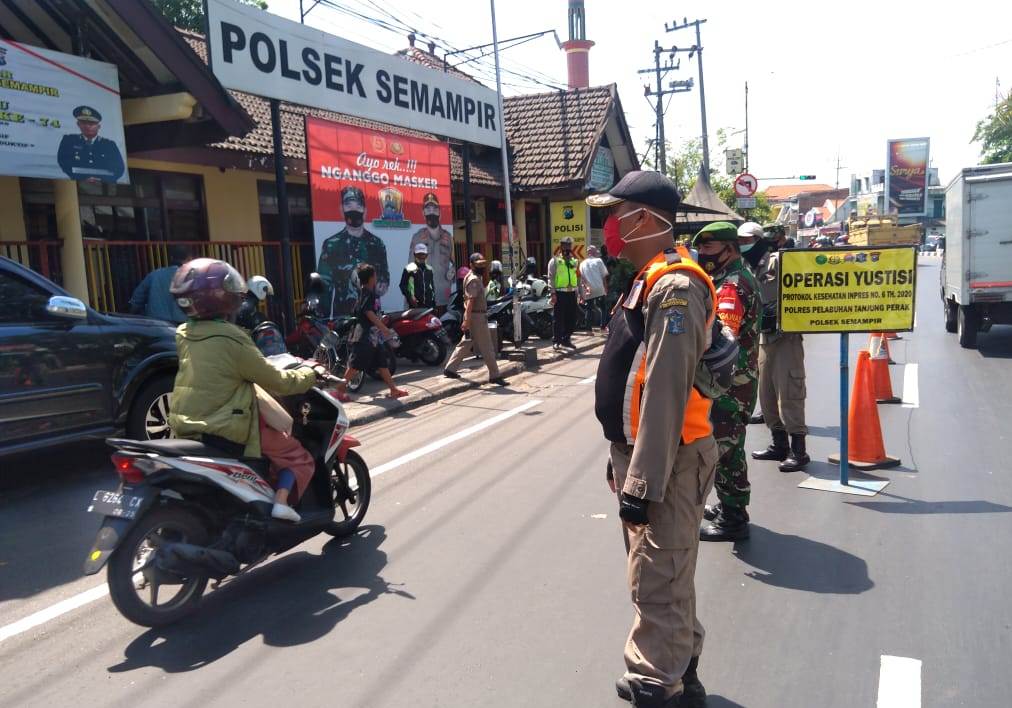 Seputarperak.com- Operasi yustisi protokol kesehatan digelar Polsek Semampir, Polres Pelabuhan Tanjung Perak, Rabu pagi, 23 September 2020 di Jalan Sultan Iskandar Muda, depan Mako.