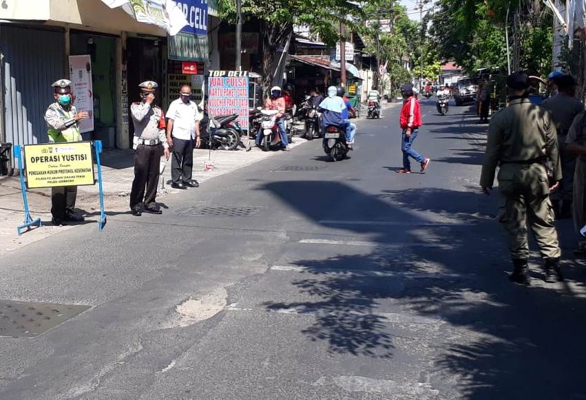 Seperti halnya yang dilakukan personil Polsek Asemrowo di Jalan Asem Raya depan kantor Kecamatan Asemrowo, Senin pagi, 28 September 2020.