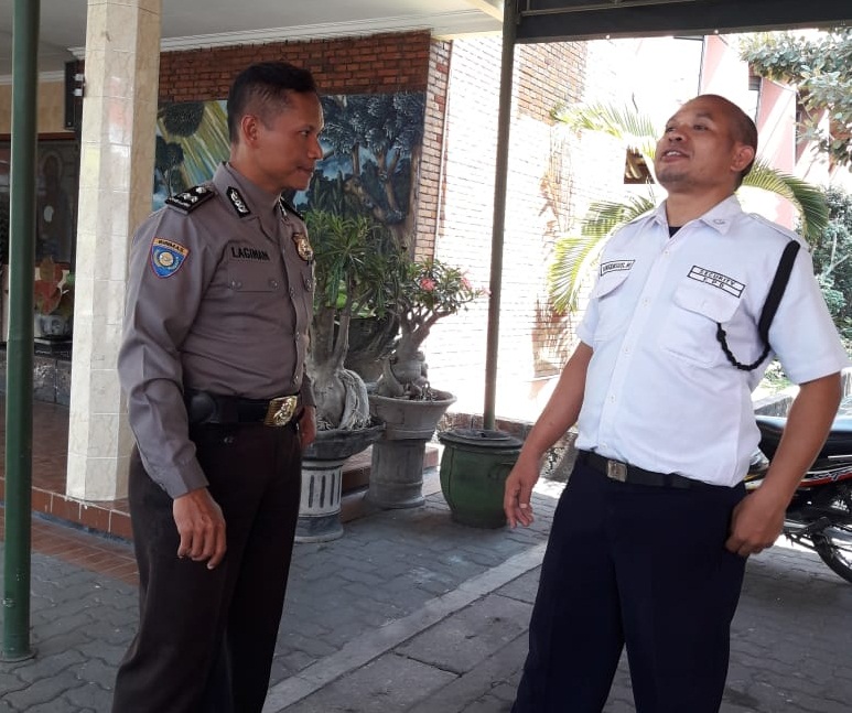 Kedatangan Aiptu Lagiman selaku Babinkamtibmas Takal Kedinding, Polsek Kenjeran ini disambut hangat oleh petugas sekuriti gereja yang bernama Bapak Vincensius.