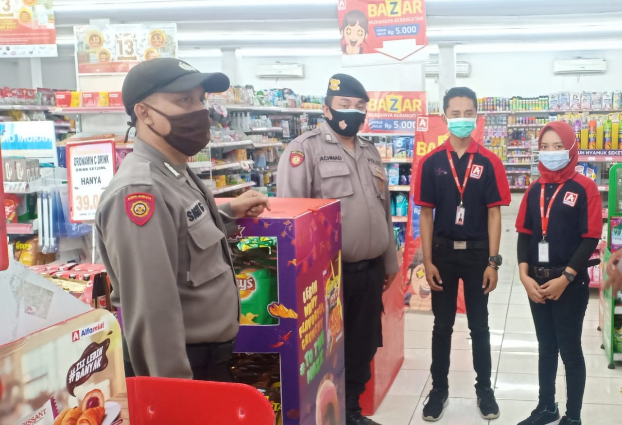 Seputarperak.com- Patroli dialogis dilakukan personil Unit Sabhara Polsek Krembangan, Polres Pelabuhan Tanjung Perak di mini market Alfamart, Jalan Demak, Kamis malam, 22 Oktober 2020.