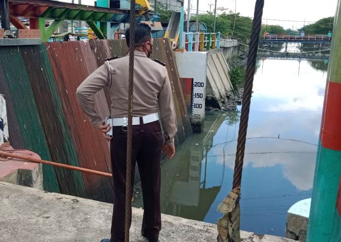 Seputarperak.com- Pemantauan debit air dilakukan personil Polsek Kenjeran, Polres Pelabuhan Tanjung Perak di Pintu Air Tambak Wedi Lama, Senin siang, 2 Nopember 2020.