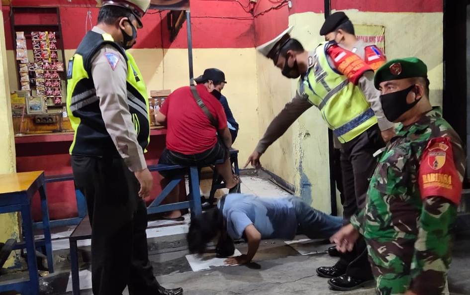 Masing-masing diberikan sanksi fisik berupa push up dan selanjutnya diberikan masker gratis sambil diingatkan untuk selalu memakai masker saat berada di luar rumah guna mencegah penularan Covid-19 atau virus corona.