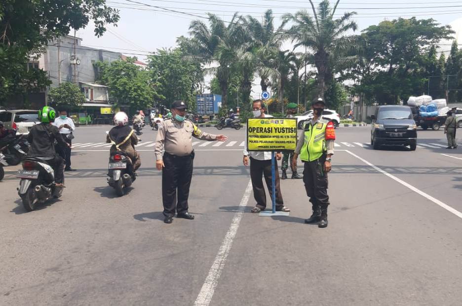 Seputarperak.com- Polsek Semampir, Polres Pelabuhan Tanjung Perak melaksanakan operasi yustisi protokol kesehatan di Jalan KH Mas Mansyur, depan Hotel Quds Royal, Senin pagi, 9 Nopember 2020.