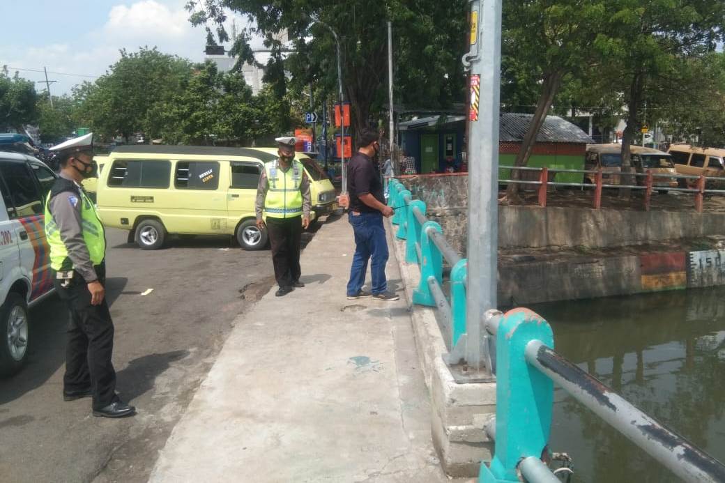 Seputarperak.com- Pemantauan debit air dilakukan personil Polsek Pabean Cantikan, Polres Pelabuhan Tanjung Perak di Sungai Kalimas, Minggu pagi, 15 Nopember 2020.