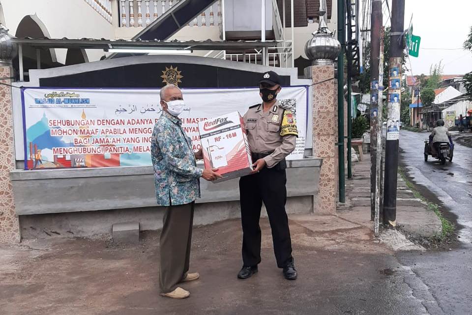 Disamping menyerahkan bantuan tersebut, Aiptu Hari Kurniawan juga mengingatkan agar Bapak H Jaenal Ishom rajin membersihkan lantai masjid dan tempat-tempat yang rawan dipegang oleh jamaah dengan menggunakan cairan disinfektan.