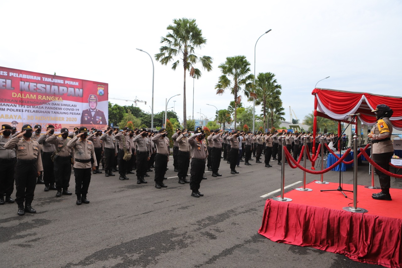 Dalam kegiatan ini juga dilaksanakan simulasi pengamanan TPS di wilayah hukum Polres Pelabuhan Tanjung Perak yang menerapkan protokol kesehatan pencegahan Covid-19.