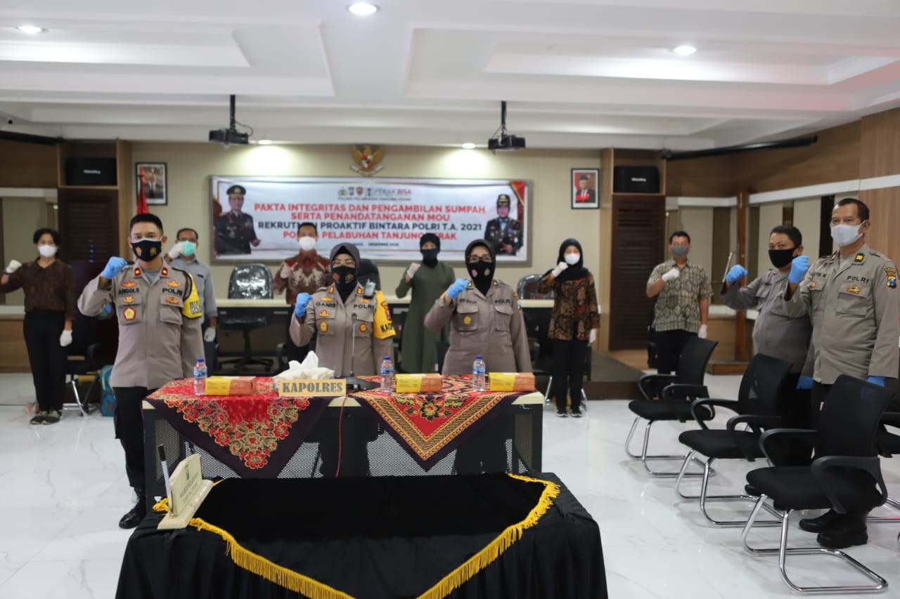 Seputarperak.com- Penandatanganan pakta integritas dan pengambilan sumpah serta MoU seleksi Rekrutmen Proaktif (Rekpro) dalam penerimaan Bintara Polri tahun 2021 dilaksanakan di Aula Rupatama Sanika Satyawada Polres Pelabuhan Tanjung Perak, Selasa pagi, 8 Desember 2020.