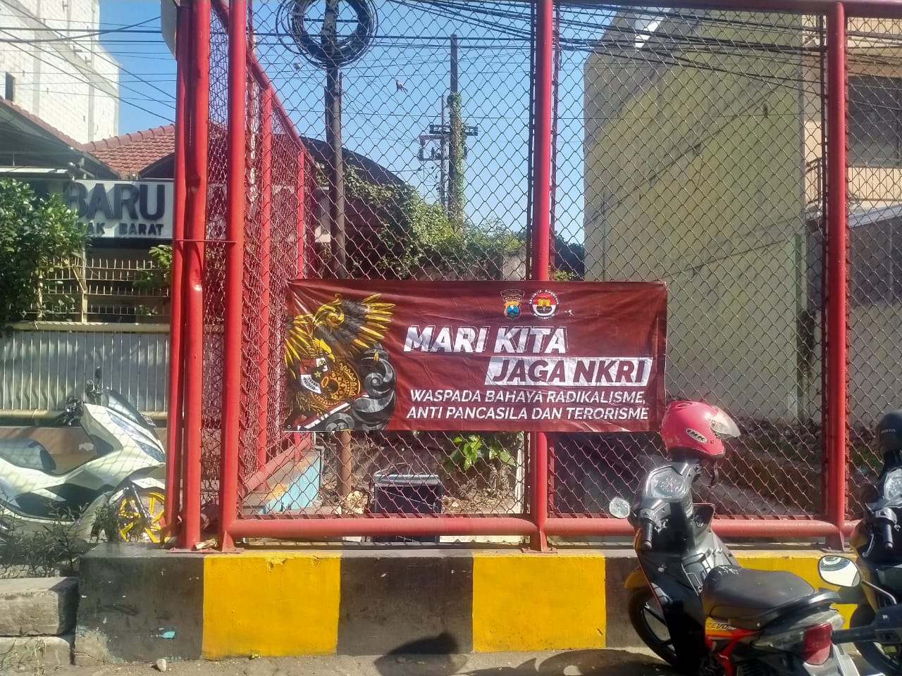 Sebuah spanduk membentang dengan tulisan, ‘Mari Kita Jaga NKRI, Waspada Bahaya Radikalisme Anti Pancasila dan Terorisme’ terlihat jelas bagi para pengguna jalan.