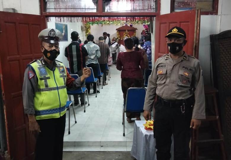 Seputarperak.com- Personil Polsek Pabean Cantikan, Polres Pelabuhan Tanjung Perak diterjunkan untuk melakukan pengamanan kebaktian malam Natal di Gereja Silo, Jalan Dapuan, Kamis malam, 24 Desember 2020.