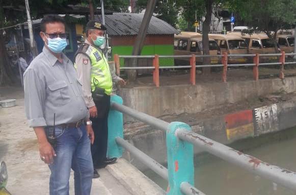 Seputarperak.com- Pemantauan debit air dilakukan personil Polsek Pabean Cantikan, Polres Pelabuhan Tanjung Perak di Sungai Kalimas, Kamis siang, 7 Januari 2021.