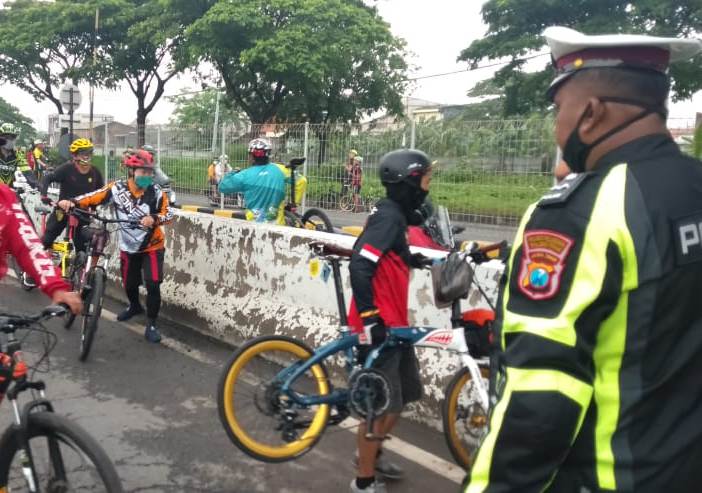 Anggota komunitas gowes pun tak bisa berkutik saat perjalanan mereka yang akan melewati pintu tol Suramadu diberhentikan dan diminta putar arah.