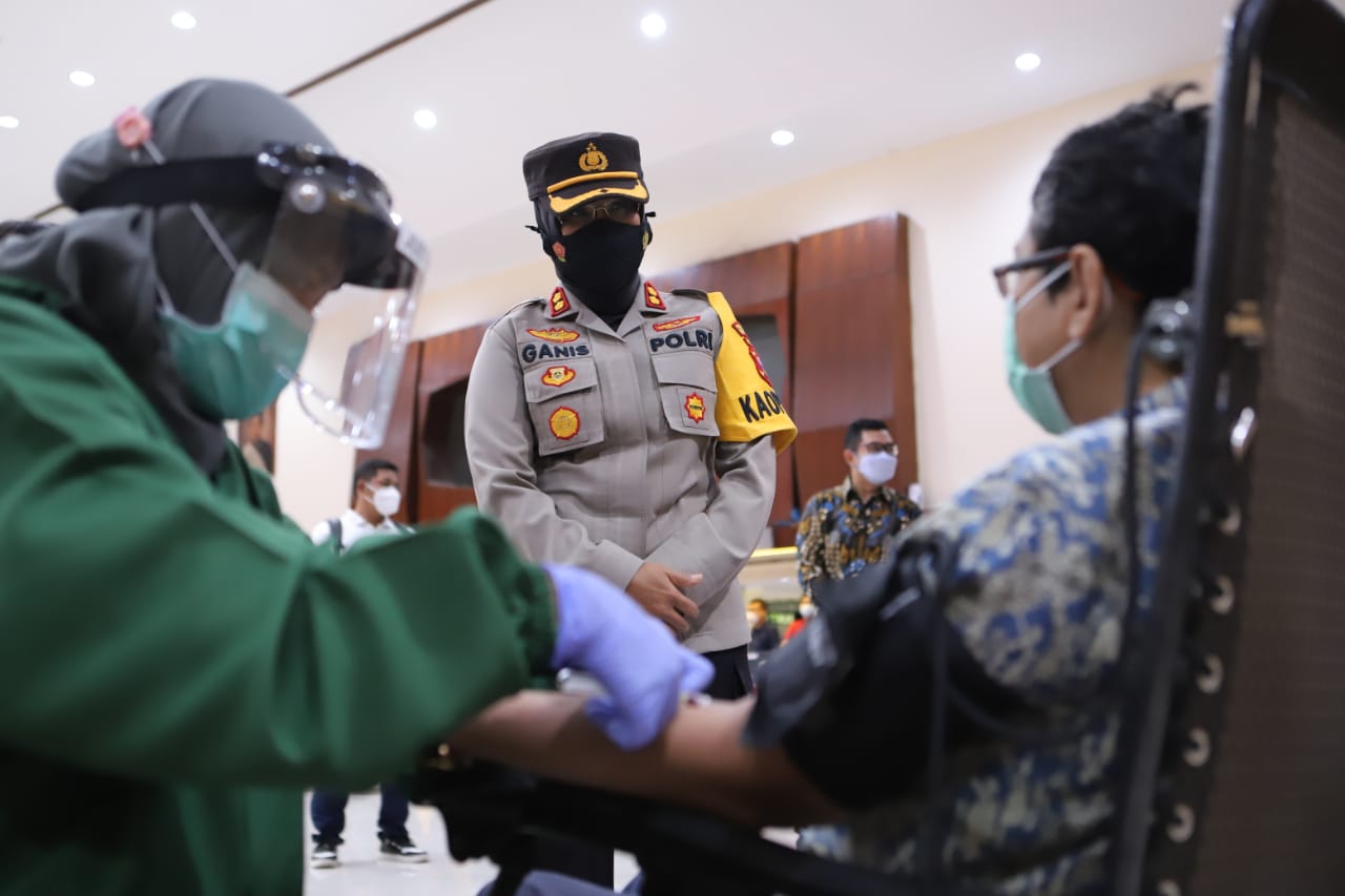 Seputarperak.com- Kapolres Pelabuhan Tanjung Perak, AKBP Ganis Setyaningrum, S.Si, MH, bersama para pejabat utama (PJU) Polres Pelabuhan Tanjung Perak ikut menghadiri kegiatan donor plasma konvalesen yang digelar di Gedung Wanita Candra Kencana di Jalan Kalibokor Selatan.
