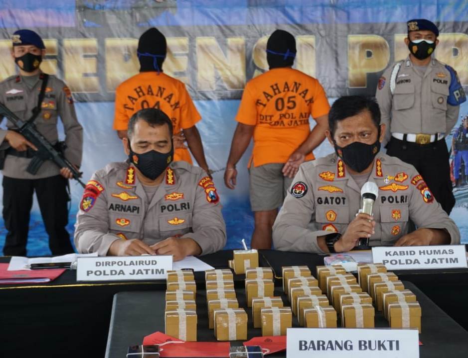 Penangkapan kedua tersangka bermula saat tim Intelair Ditpolairud Polda Jatim melakukan penyelidikan di wilayah Pelabuhan Jangkar Situbondo. Dari penyelidikan tersebut, akhirnya petugas meringkus dua tersangka dan membawanya ke mako.
