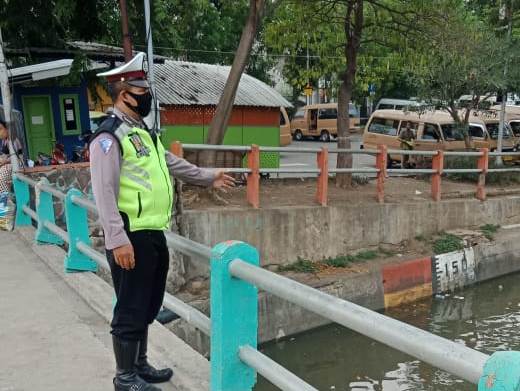 Seputarperak.com- Pemantauan debit air dilakukan personil Polsek Pabean Cantikan, Polres Pelabuhan Tanjung Perak di Sungai Kalimas, Sabtu siang, 27 Pebruari 2021.