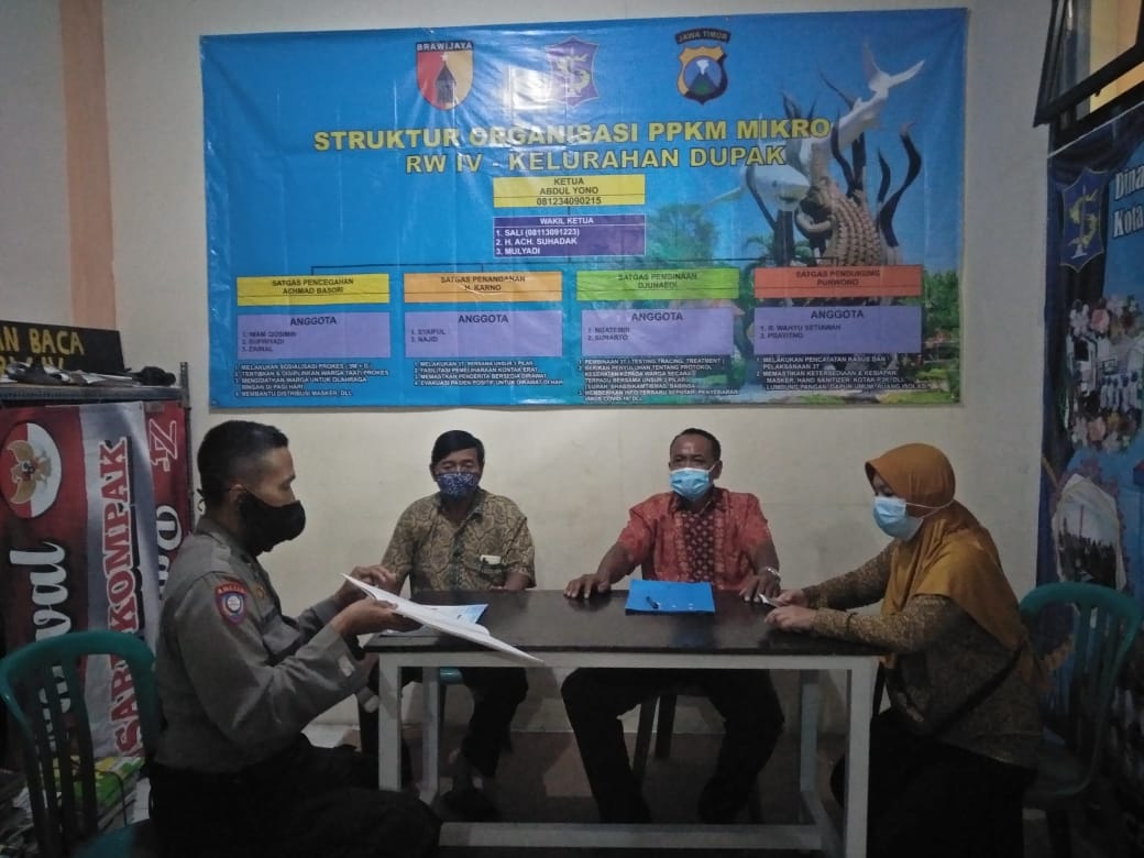 Seputarperak.com- Kunjungan dilakukan Ipda Eko Mustaghfirin, Panit Binmas Polsek Krembangan, Polres Pelabuhan Tanjung Perak di Posko PPKM Berbasis mikro yang ada di Kelurahan Dupak, Jumat malam, 5 Maret 2021.