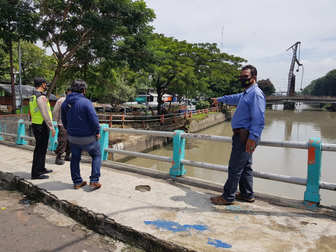 Seputarperak.com- Pemantauan debit air dilakukan personil Polsek Pabean Cantikan, Polres Pelabuhan Tanjung Perak di Sungai Kalimas, Rabu siang, 24 Maret 2021.