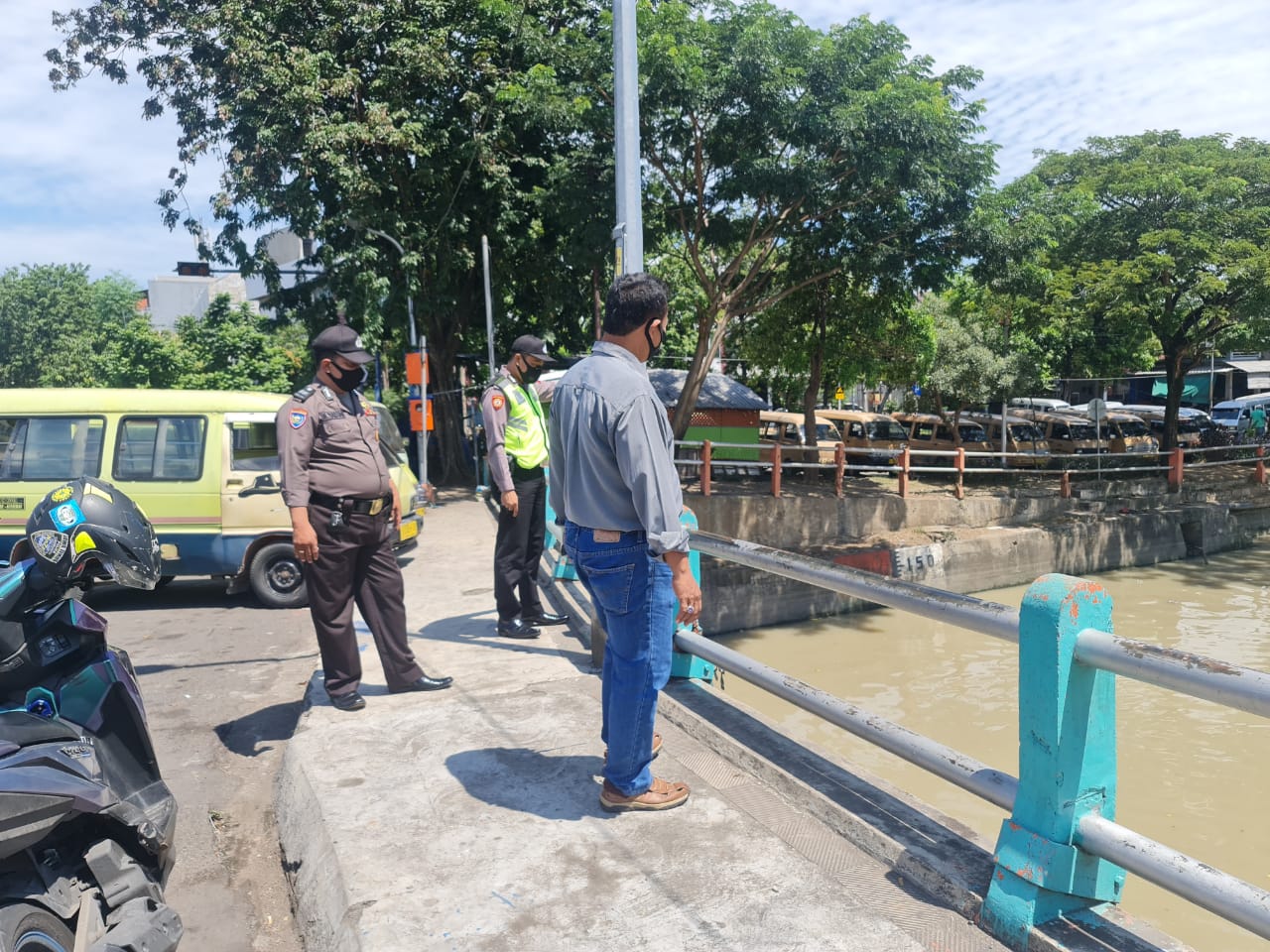 Seputarperak.com- Pemantauan debit air dilakukan personil Polsek Pabean Cantikan, Polres Pelabuhan Tanjung Perak di Sungai Kalimas, Sabtu siang, 3 April 2021.