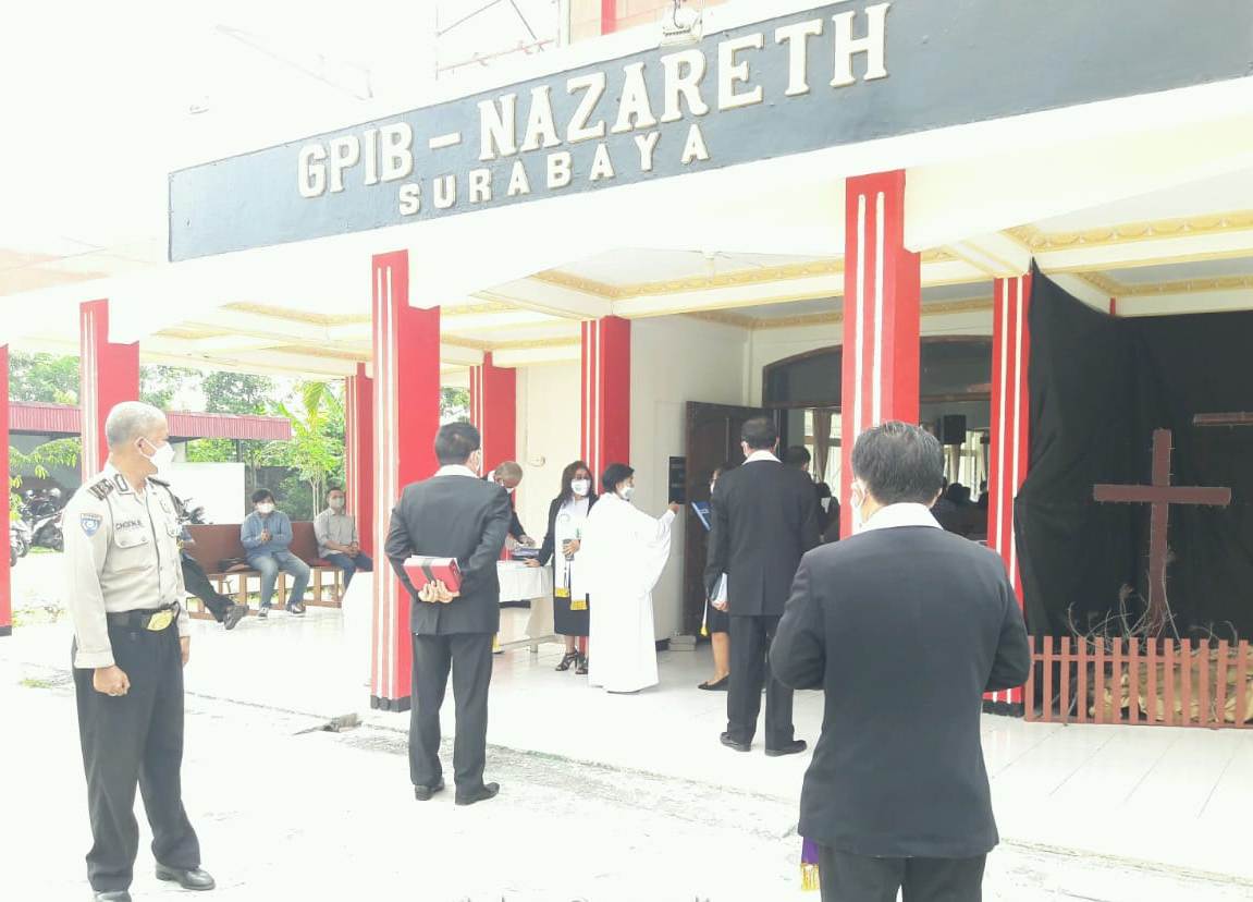 Seputarperak.com- Beberapa personil Polsek Kenjeran, Polres Pelabuhan Tanjung Perak diterjunkan untuk melakukan pengamanan kebaktian di Gereja Nazareth Jalan Wiratno, Minggu pagi, 4 April 2021.