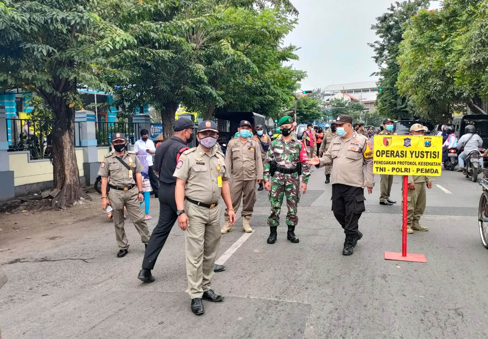 Seputarperak.com- Operasi yustisi protokol kesehatan dalam bentuk operasi penertiban masker digelar Polsek Semampir, Polres Pelabuhan Tanjung Perak bersama instansi samping di Jalan Pegirian, depan kantor Kelurahan Ampel Selasa pagi, 6 April 2021.