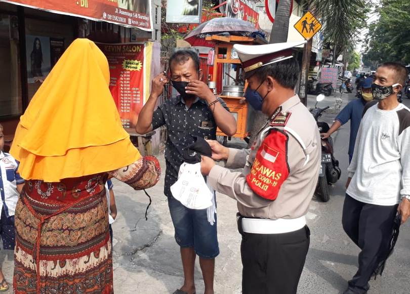 Saat itu personil Polsek Asemrowo bersama Satpol PP membagikan masker secara cuma-cuma sambil menyampaikan pentingnya penggunaan masker untuk mencegah penyebaran Covid-19.