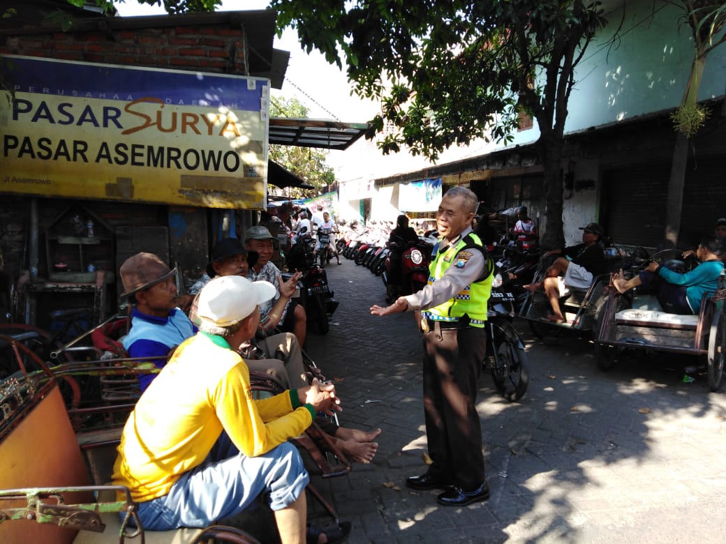 Seputarperak.com- Himbauan ketertiban disampaikan Aiptu Muchson, Babinkamtibmas Genting Kalianak, Polsek Asemrowo, Polres Pelabuhan Tanjung Perak, kepada para penarik becak yang biasa mangkal di depan Pasar Surya Asemrowo, Selasa, 11 September 2018.