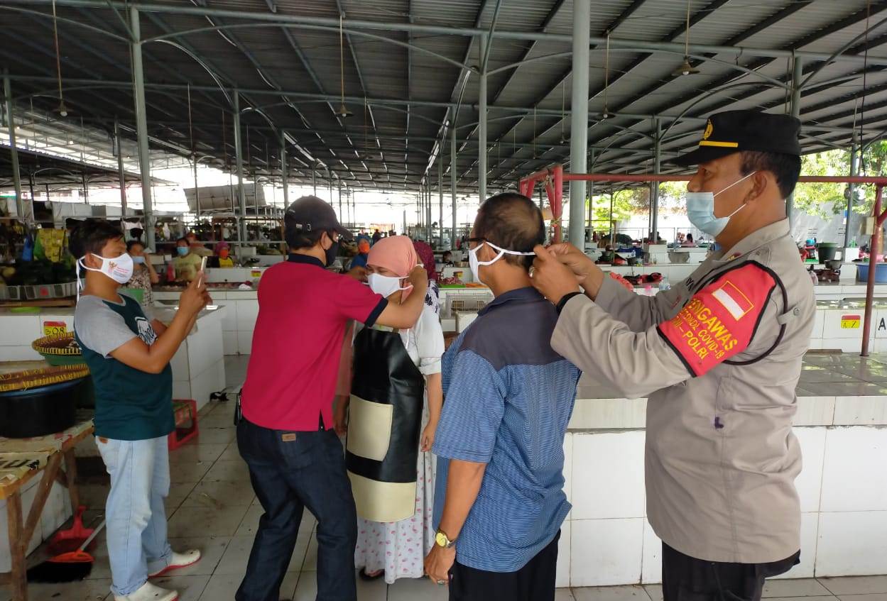 Dalam kegiatan ini diberikan masker gratis kepada pengunjung dan pedagang yang kedapatan tidak menggunakan masker.
