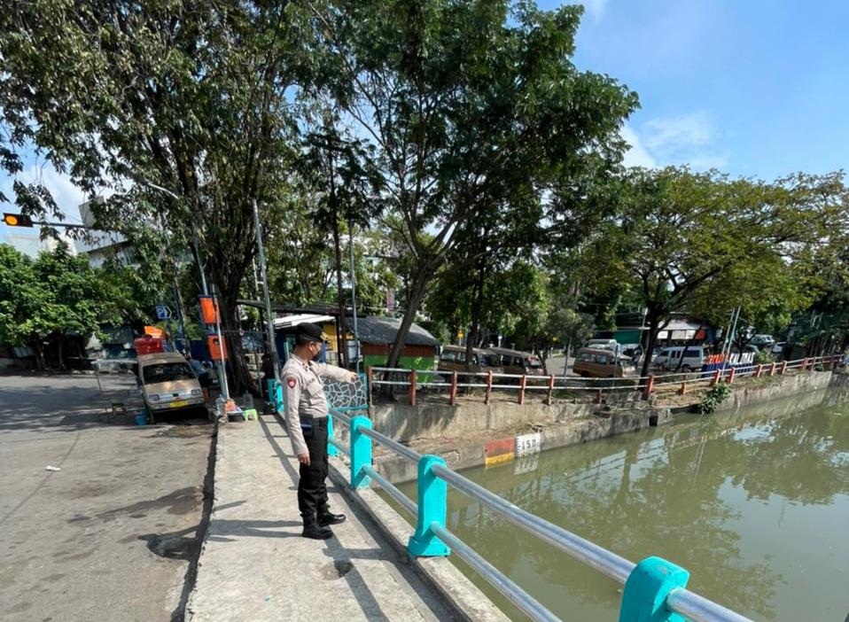 Seputarperak.com- Pemantauan debit air dilakukan personil Polsek Pabean Cantikan, Polres Pelabuhan Tanjung Perak di Sungai Kalimas, Minggu siang, 20 Juni 2021.