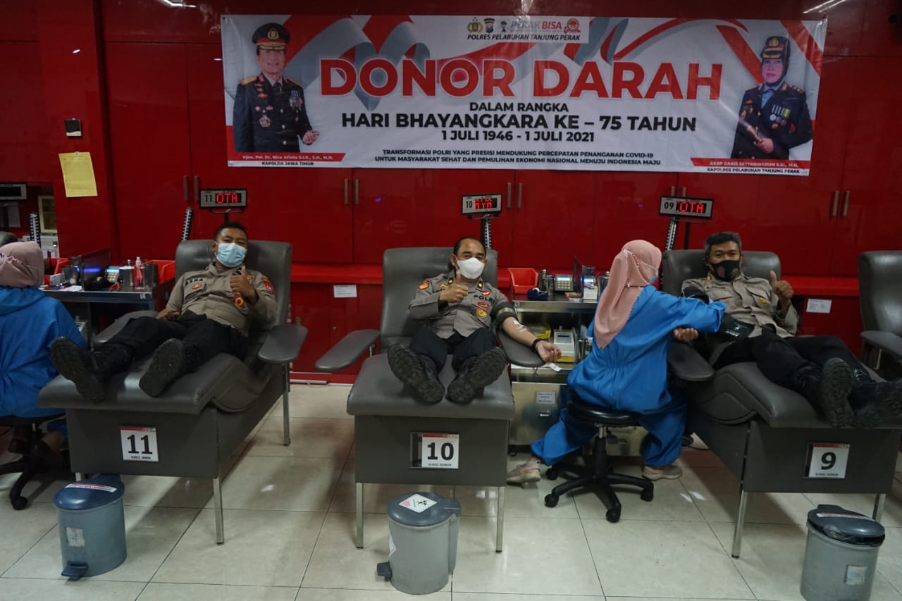 Seputarperak.com- Memperingati Hari Bhayangkara Ke-75, Polres Pelabuhan Tanjung Perak melaksanakan kegiatan donor darah, Rabu, 23 Juni 2021.