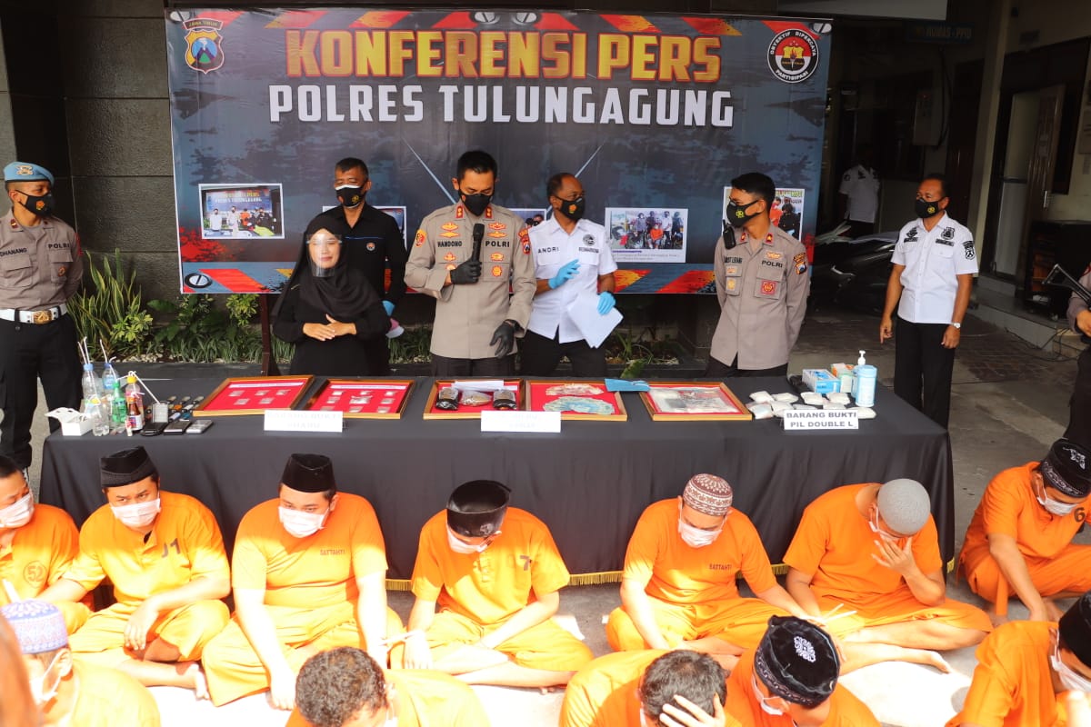 Kapolres Tulungagung AKBP Handono Subiakto SH, SIK, MH saat menggelar konferensi pers dihalaman Mapolres Tulungagung, Kamis (24/6/21) menyampaikan, dari 104 pelaku dan barang bukti sabu seberat 338 gram diamankan dari 86 TKP yang berbeda yang tersebar diwilayah hukum Polres Tulungagung.