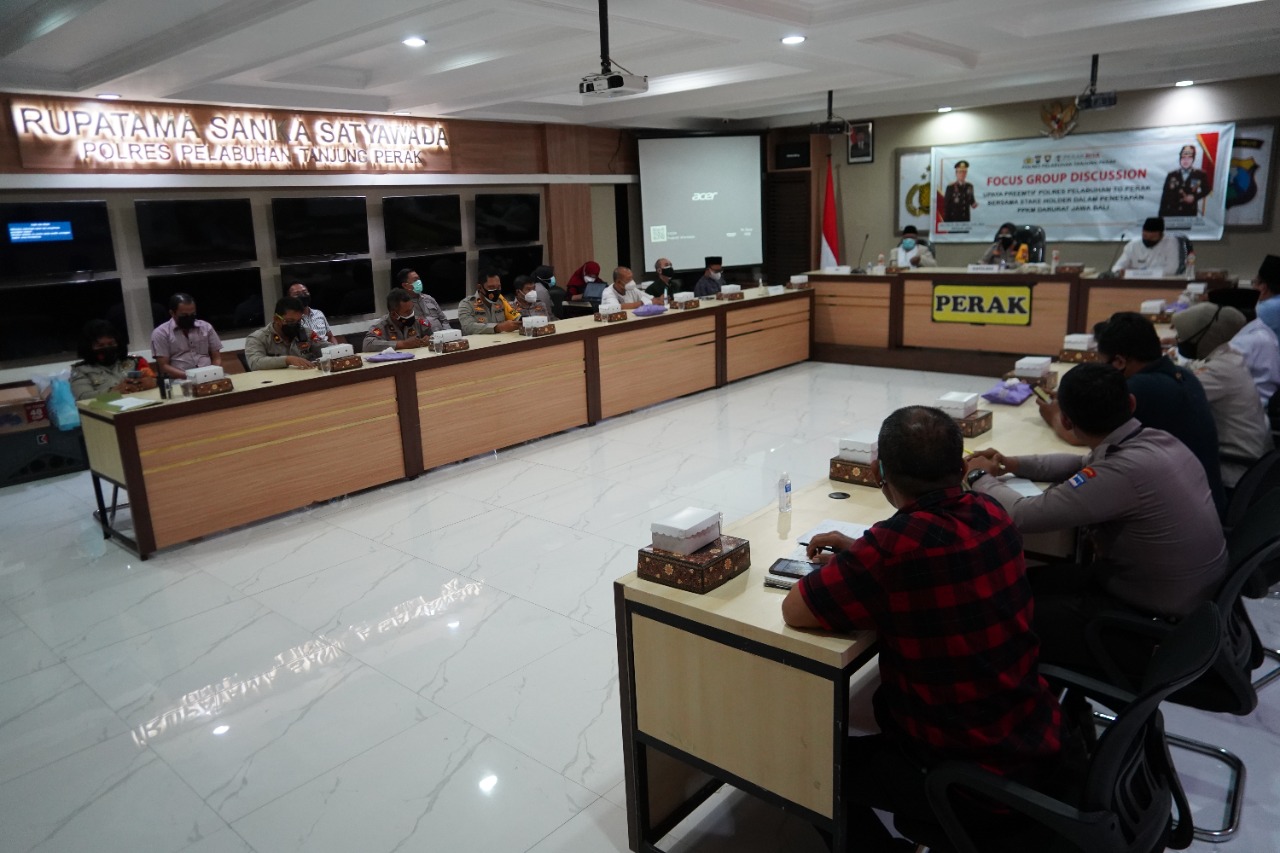 Dalam pertemuan FGD ini dibahas tentang penerapan PPKM Darurat yang bertujuan untuk memutus rantai penyebaran Covid-19 di wilayah hukum Polres Pelabuhan Tanjung Perak, sesuai Inmendagri nomor 15 tahun 2021 terkait pemberlakuan PPKM Darurat Jawa Bali.