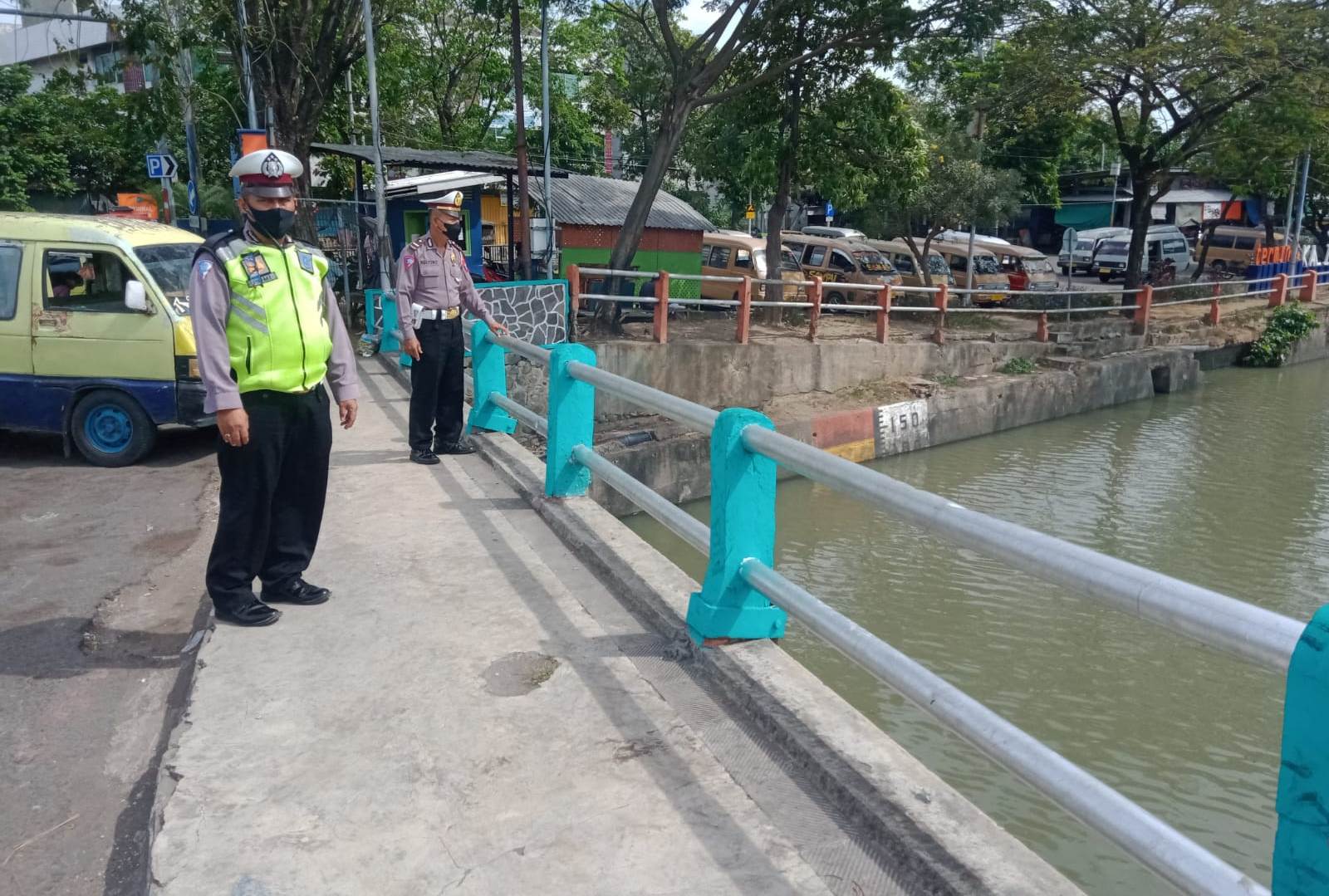 Seputarperak.com- Pemantauan debit air dilakukan personil Polsek Pabean Cantikan, Polres Pelabuhan Tanjung Perak di Sungai Kalimas, Senin siang, 12 Juli 2021.
