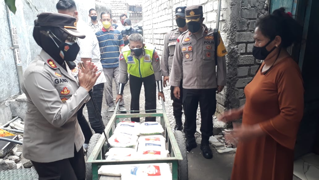 Seputarperak.com- Kapolres Pelabuhan Tanjung Perak, AKBP Ganis Setyaningrum, S.Si, MH didampingi Kapolsek Asemrowo, Kompol Hari Kurniawan, membagian bantuan beras kepada masyarakat di wilayah Asemrowo, Sabtu, 17 Juli 2021.