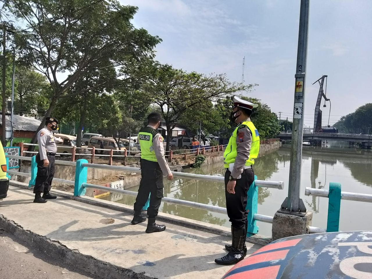 Seputarperak.com- Pemantauan debit air dilakukan personil Polsek Pabean Cantikan, Polres Pelabuhan Tanjung Perak di Sungai Kalimas, Jumat siang, 23 Juli 2021.