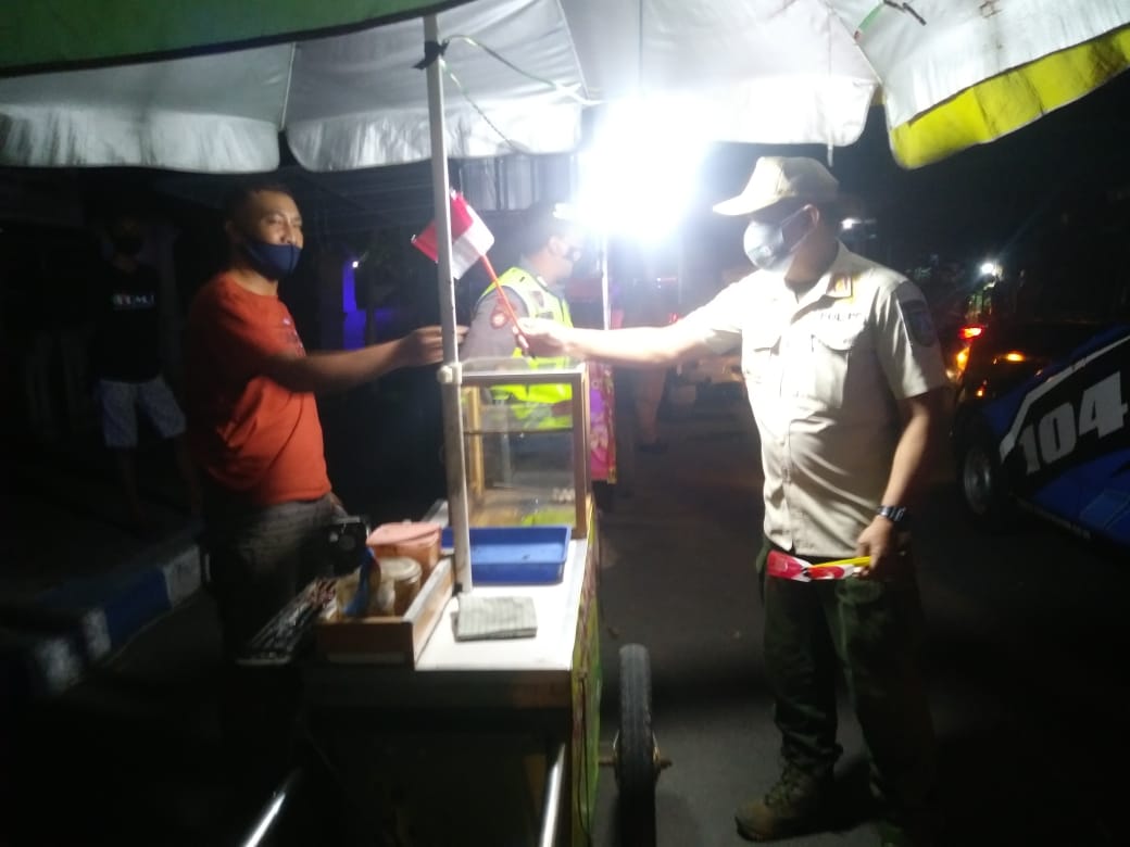 Seputarperak.com- Personil gabungan terdiri Polres Jombang, Kodim 0814 dan Satpol PP Pemkab Jombang melaksanakan operasi yustisi sekaligus membagikan bendera merah putih kepada pedagang kaki lima (PKL). Para pedagang dengan kompak mengibarkan bendera merah putih tersebut.