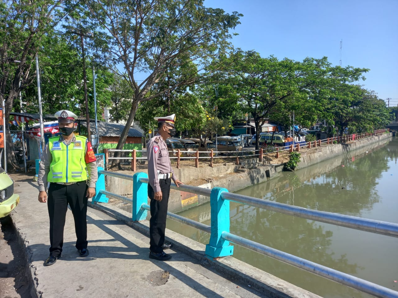 Seputarperak.com- Pemantauan debit air dilakukan personil Polsek Pabean Cantikan, Polres Pelabuhan Tanjung Perak di Sungai Kalimas, Kamis siang, 12 Agustus 2021.