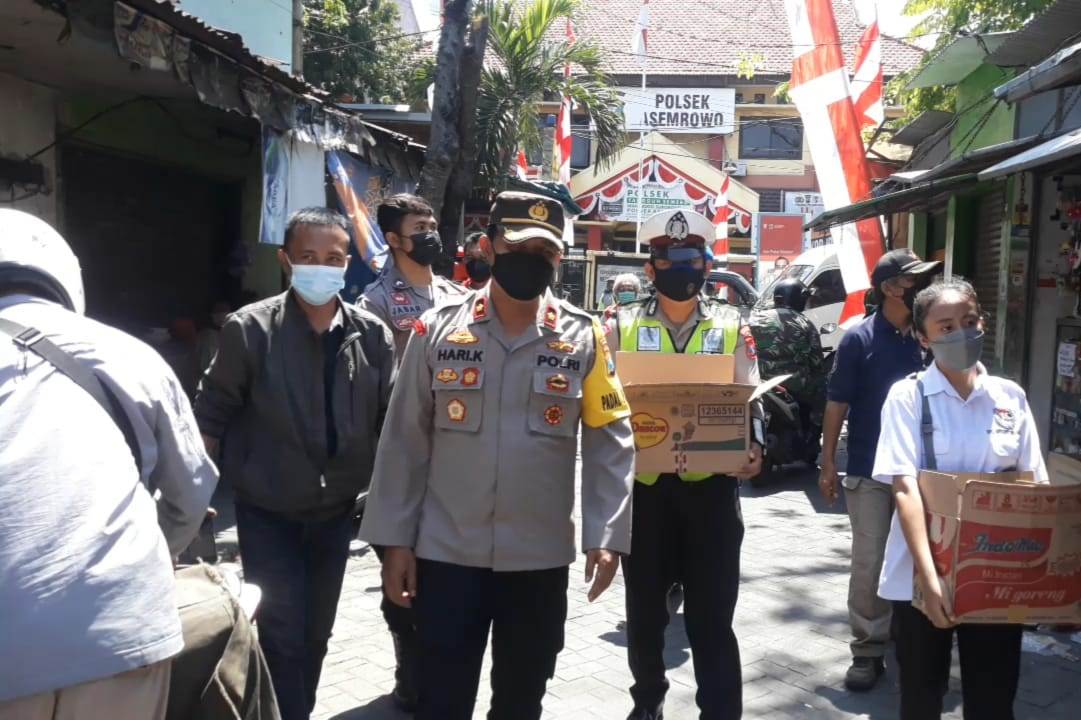 Sambil membagikan bantuan nasi bungkus, Kapolsek Asemrowo dan para personil tidak lupa menyampaikan agar patuh protokol kesehatan.