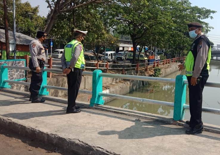 Seputarperak.com- Pemantauan debit air dilakukan personil Polsek Pabean Cantikan, Polres Pelabuhan Tanjung Perak di Sungai Kalimas, Selasa siang, 17 Agustus 2021.