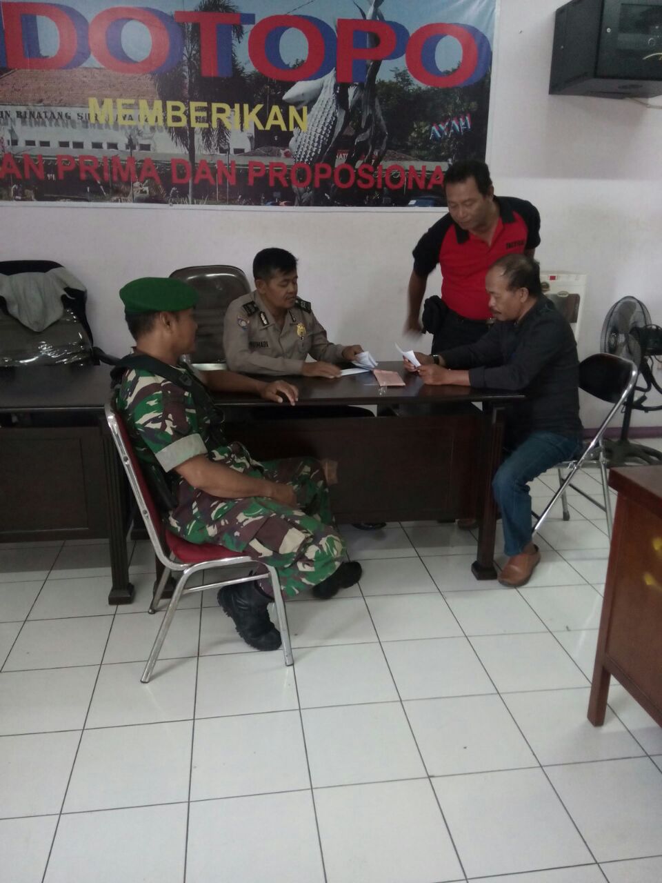 Sabtu pagi, 19 Mei 2018, Aiptu Muhadi Syukur selaku Babinkamtibmas Kelurahan Sidotopo, Polsek Semampir, tengah mengadakan koordinasi dengan Babinsa dan Kepala Kelurahan Sidotopo.