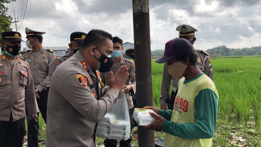 Kapolresta Banyuwangi AKBP Nasrun Pasaribu di tengah kesibukan aktivitasnya nelaksanakan program jumat berkah memberikan bantuan berupa makanan kepada masayarakat pinggiran petani dan profesi lainnya dengan cara menghampiri langsung ditengah kegiatannya.